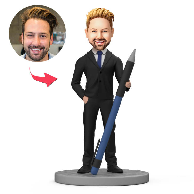 Individuelle Wackelkopf-figur „business Man Hold Pencil“ Mit Eingraviertem Text