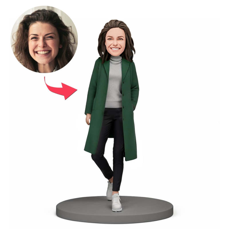 Weihnachtsgeschenk Für Sie. Individueller Wackelkopf. Stilvolle Dame Im Armeegrünen Mantel