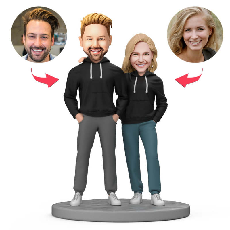 Paar Trägt Schwarze Sportbekleidung, Individuelle Wackelkopffigur Mit Eingraviertem Text