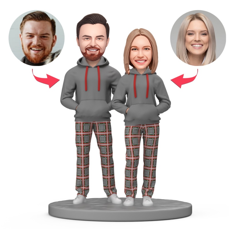 Paar Trägt Einen Grauen Trainingsanzug Mit Individuellem Wackelkopf Und Eingraviertem Text