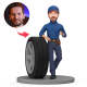 Kundenspezifischer Wackelkopf-hübscher Autoingenieur, Automechaniker, Der Sich Auf Einen Reifen Stützt