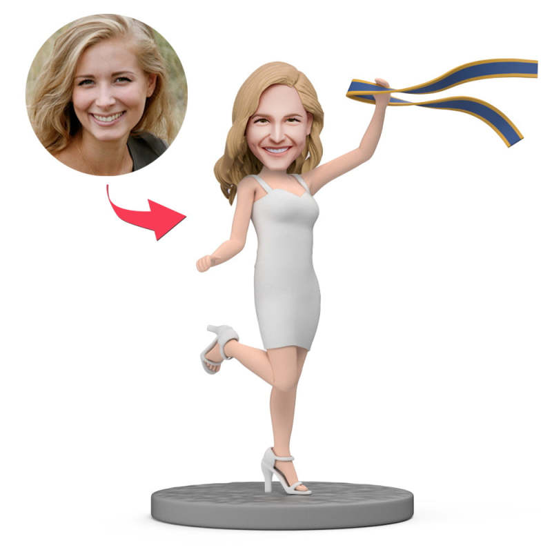 Maßgeschneiderte Wackelköpfe Für Die Abschlussfeier Einer Frau Im Weißen Kleid Mit Schwebendem Band