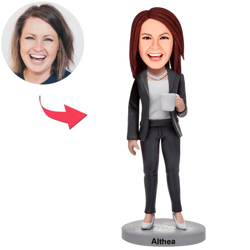 Geschäftsfrau mit einem Wasserglas Wackelkopf Figuren Mit Graviertem Text