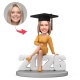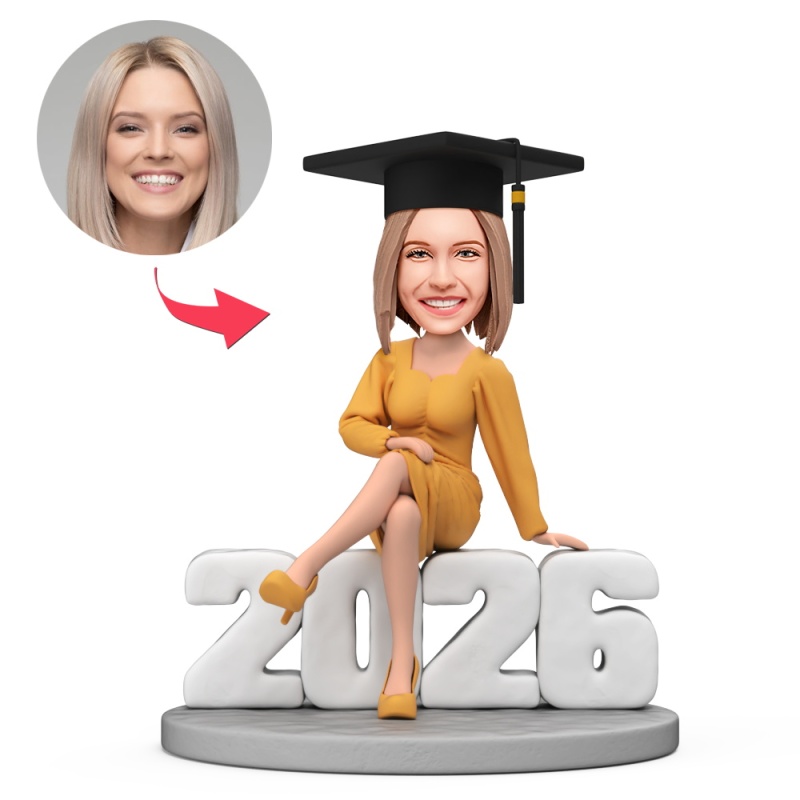 Individuell Gestaltete Absolventin Mit Absolventenhut Und Gelbem Kleid, Sitzend Auf Einer Wackelkopffigur Mit Der Jahreszahl 2026 Und Eingraviertem Text – Geschenk