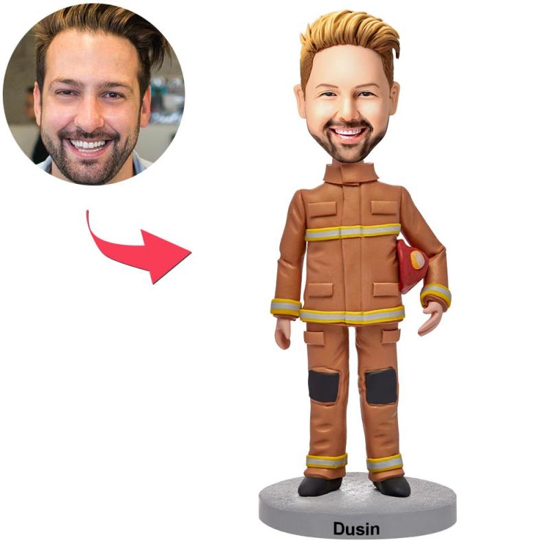 Männlicher Feuerwehrmann in Uniform Wackelkopf Figuren Mit Graviertem Text