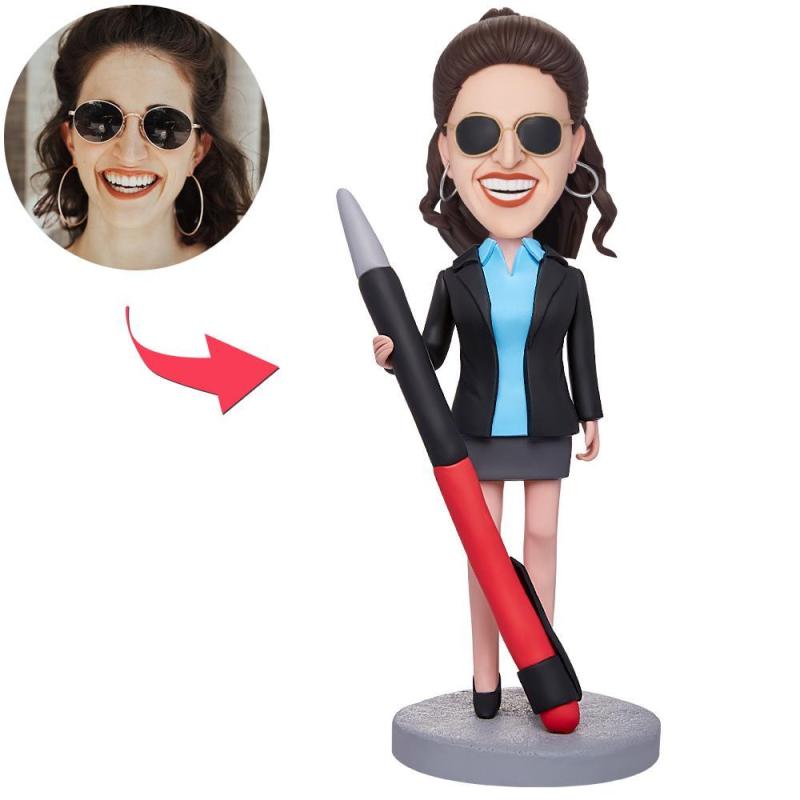 Chefin und ein Bleistift Wackelkopf Figuren Mit Graviertem Text