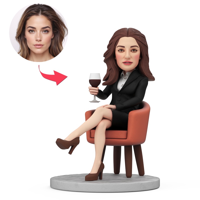 Weibliche Chefin Sitzt Auf Einem Stuhl Und Hält Ein Rotweinglas. Individuelle Wackelkopffigur Mit Eingraviertem Text Als Geschenk Zum Tag Des Chefs.
