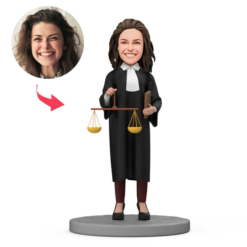 Anwältin Hält Waage Und Buch In Den Händen. Individuelle Wackelfigur Mit Eingraviertem Text