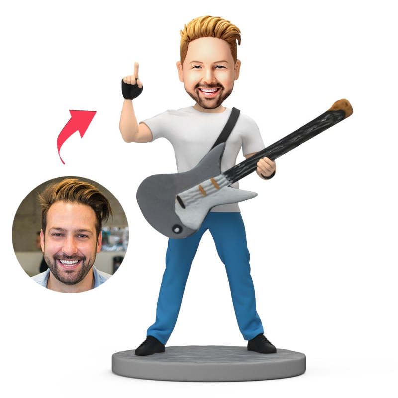 Glücklicher Mann, Weißes Hemd Mit Gitarre, Individueller Wackelkopf Mit Eingraviertem Text Für Papa