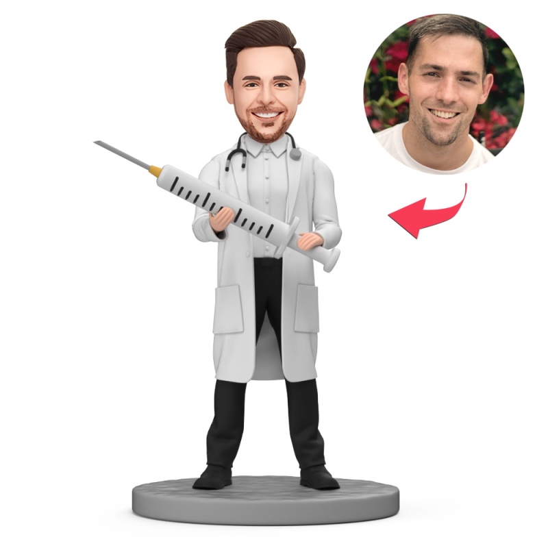 Männlicher Arzt Hält Spritze In Der Hand. Individueller Wackelkopf Mit Eingraviertem Text