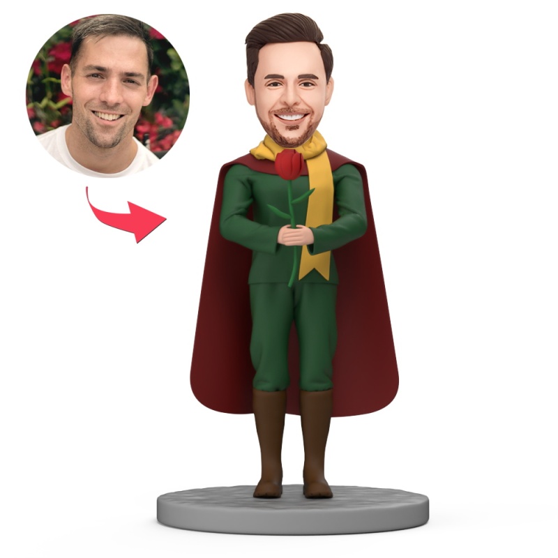 Männlicher Gentleman Hält Einen Personalisierten Wackelkopf Mit Rose Und Eingraviertem Text