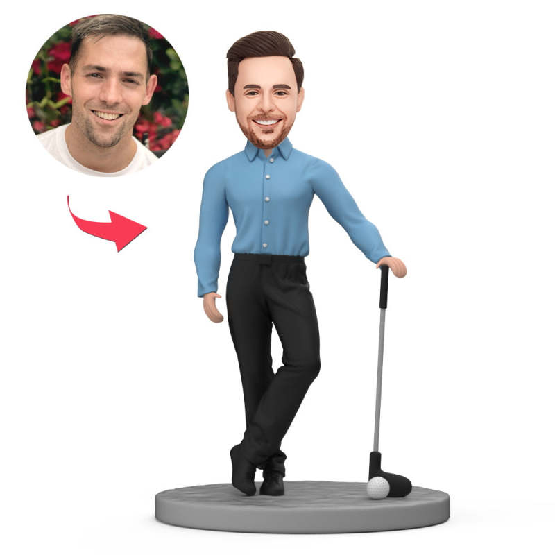 Männliche Golfkleidung, Blaues Hemd Und Schwarze Hose, Individueller Wackelkopf Mit Eingraviertem Text