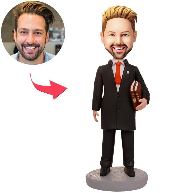 Männlicher Anwalt, der ein Buch hält Wackelkopf Figuren Mit Graviertem Text