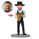 Mann Spielt Saxophon, Trägt Schwarze Hosen Und Hält In Der Hand Einen Individuellen Wackelkopf Mit Eingraviertem Text