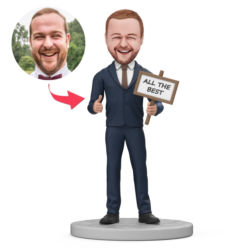 Mann Trägt Blauen Business-anzug. Alles Gute. Benutzerdefinierte Wackelkopffigur Mit Eingraviertem Text.