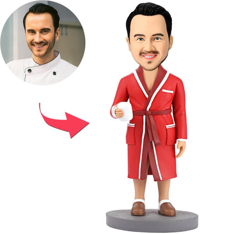 Moderner Mann Der Einen Becher Hält Wackelkopf Figuren Mit Graviertem Text
