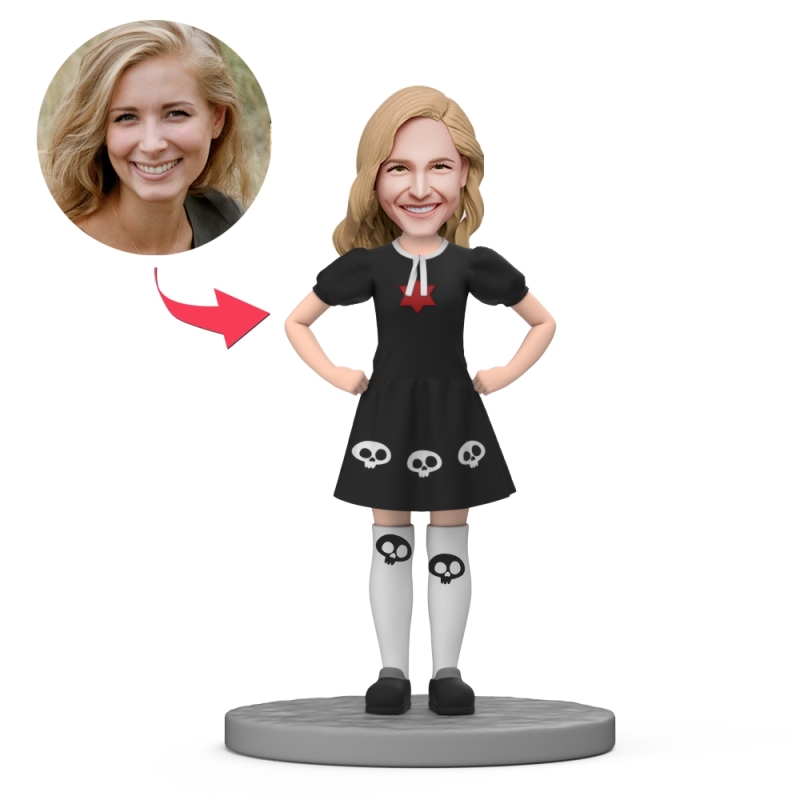 Skurrile Frau, Die Einen Rock Mit Totenköpfen Trägt. Personalisierter Wackelkopf Mit Eingraviertem Text
