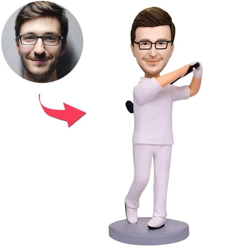Golfspieler im Weißen Anzug Wackelkopf Figuren Mit Graviertem Text